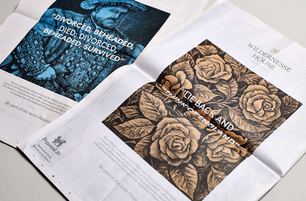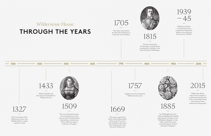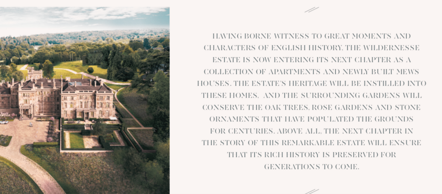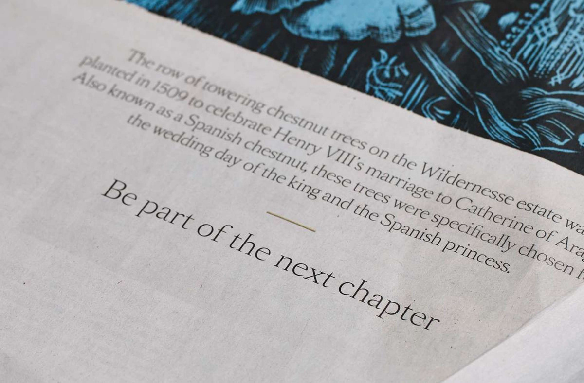 The brief was to research and write the previously untold history of Wilderness House for a prestigious brand book to act as a sales tool to sell a series of million pound plus homes. My research took me from The British Library to local Kent libraries, and deep into the lives of previous owners of the property. The result was a rich timeline and coffee table book filled with fictional re-imaginings that made prospective buyers feel part of a much bigger story.