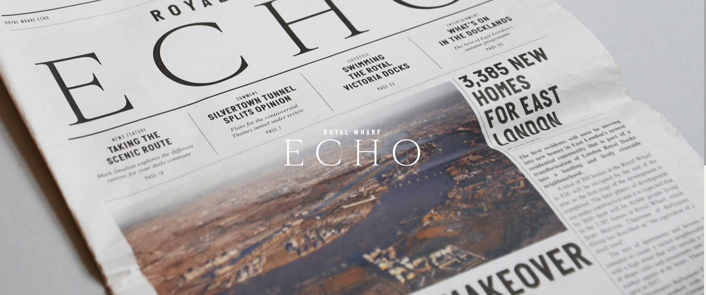 A newspaper format was chosen by Smith Dawson as a means through which to demonstrate and support Ballymore’s commitment to creating an authentic neighbourhood. The Echo was a publication designed to keep people up-to-date with the latest local news. I commissioned writers and wrote content for the team, from updates on how the construction of the scheme was developing to interviews with local wild swimmers and mudlarkers as well as listings of the best restaurants nearby and features on upcoming events.