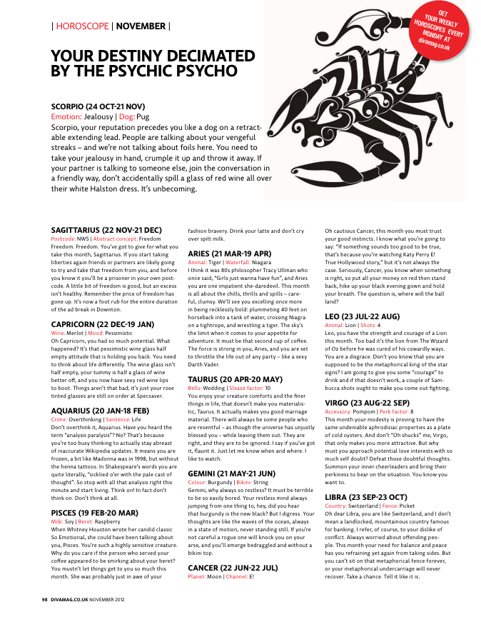 One of my responsibilities at DIVA was to write the absurdist monthly horoscope and my column Dating Tips From Beyond The Grave. Each month’s issue brought different writing challenges, and might include researching and writing serious feature articles, interviewing a celebrity for the cover, and coming up with ideas and content covering a wide range of topics and styles.