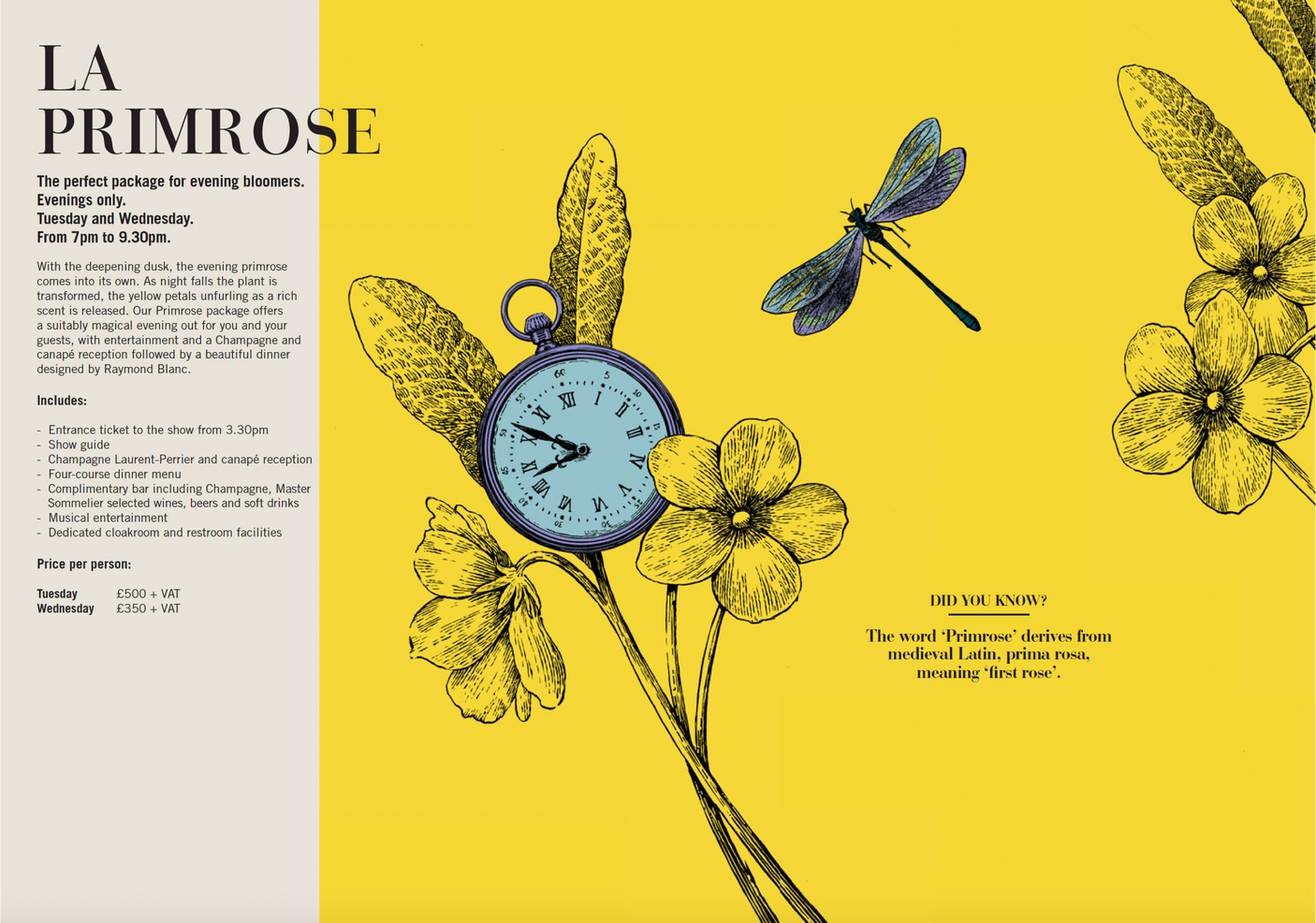 ODA commissioned me to write some whimsical copy for a set of packages for Raymond Blanc at Chelsea. They had given each a flower name that chimed with the package. My brief was to bring these to life in delightful copy with accompanying facts in a way that would set the tone for the forthcoming event and drive anticipation and sign up. The copy had to sell the benefits of the packages without being overtly salesy.